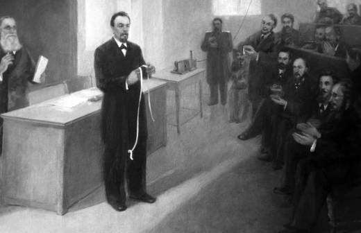 Что же произошло в этот день — 27 апреля по старому стилю, 7 мая по новому? Дело было на первый взгляд сугубо научное. В Санкт-Петербурге на заседании физического отделения Русского физико-химического общества 35-летний физик Александр Степанович Попов продемонстрировал работу своего чудо-прибора — грозоотметчика. Он показал его во время лекции «Об отношении металлических порошков к электрическим колебаниям».