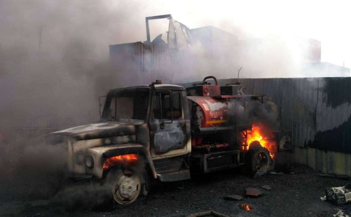 ЧП произошло вечером 17 мая в Денисьевском проезде, дом 7а. Огонь охватил два бензовоза и десять контейнеров. Площадь пожара составила 300 кв. м. По данным спасателей, в контейнерах хранились стройматериалы.