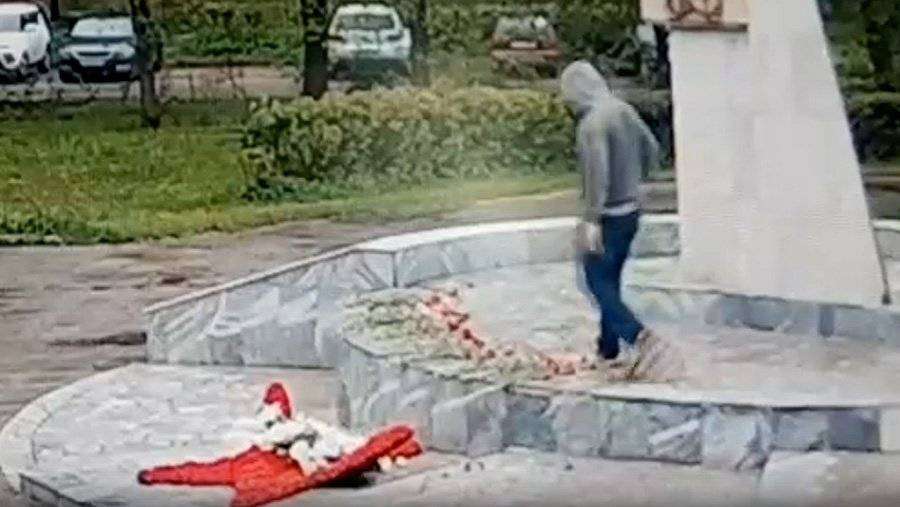 Инцидент произошел утром 23 мая. На кадрах с камер видеонаблюдения видно, как мужчина в капюшоне и с плеером сначала мирно прогуливается возле обелиска, потом забирается на постамент и начинает ногами уничтожать венок в виде пятиконечной красной звезды, а потом топтать возложенные к памятнику цветы, сообщает RT.