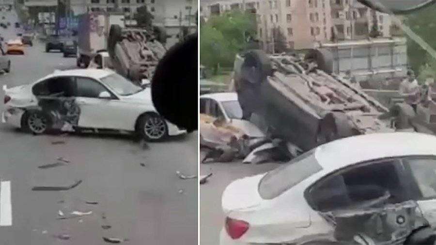 На опубликованных телеканалом кадрах аварии видно, что в результате столкновения машины разбросало по трассе, а один из автомобилей перевернулся и рухнул на такси.