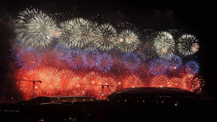 Завершили пиротехническое шоу расчеты салютных установок калибров от 105 до 310 мм, которые озарили небо снопами белых, синих и красных цветов.