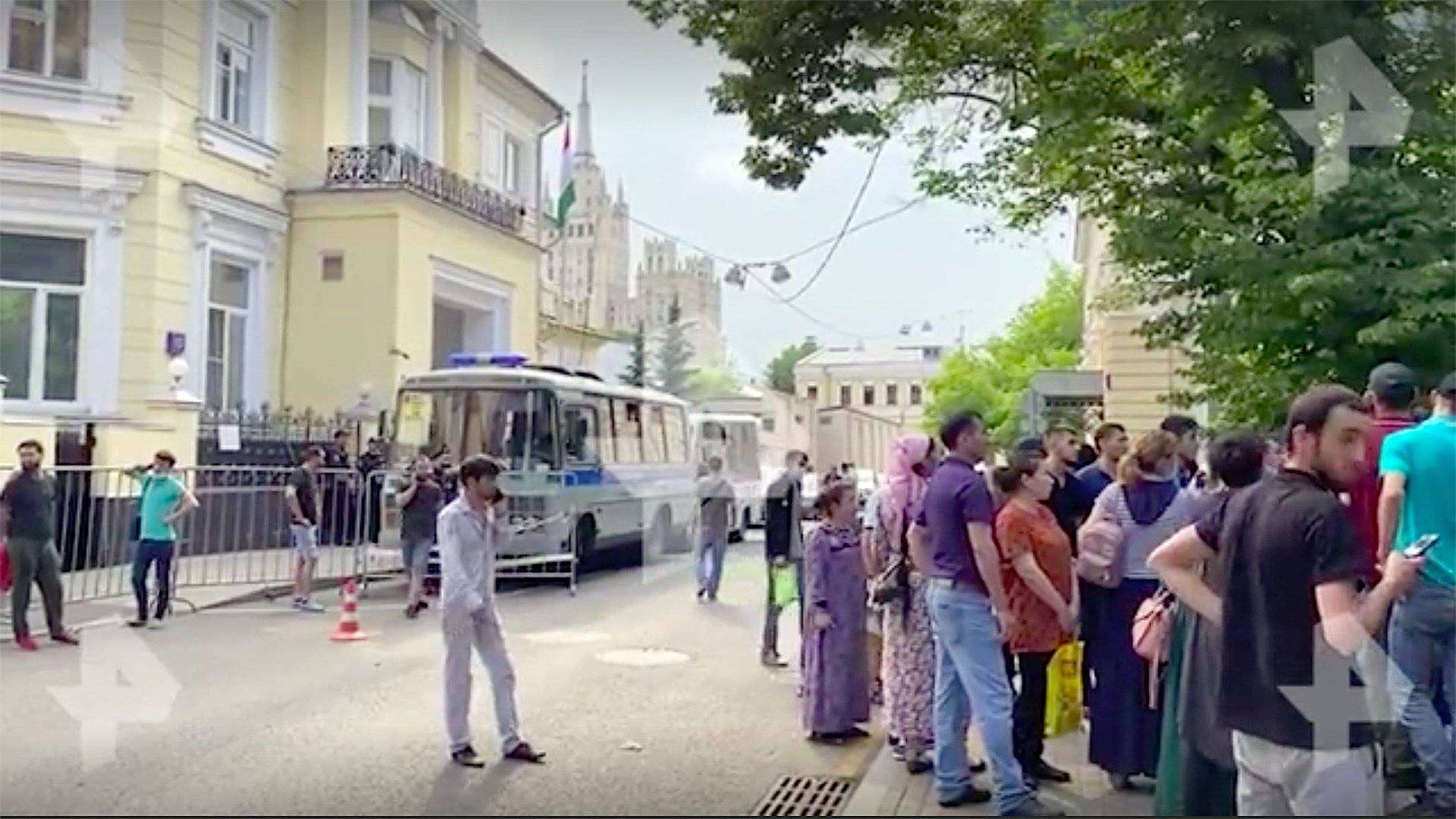 У здания посольства Таджикистана в Москве собралась толпа людей. Об этом 7 июля сообщил телеканал РЕН ТВ.