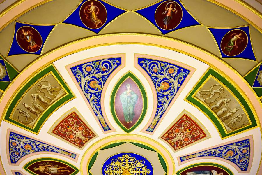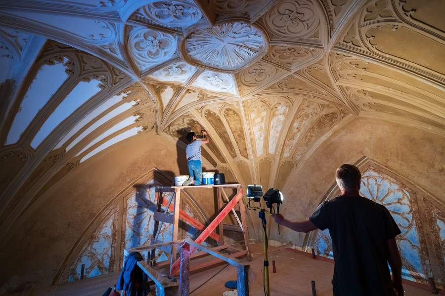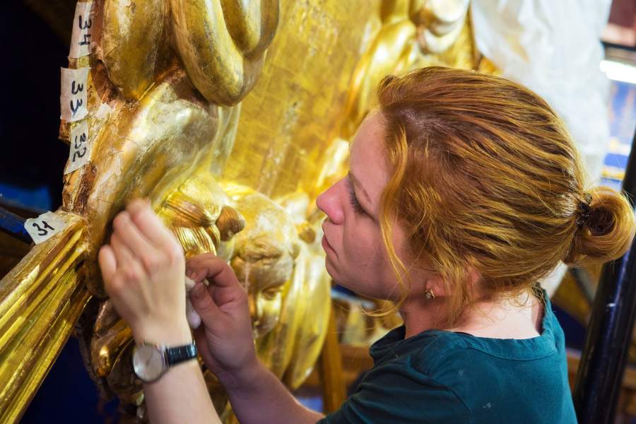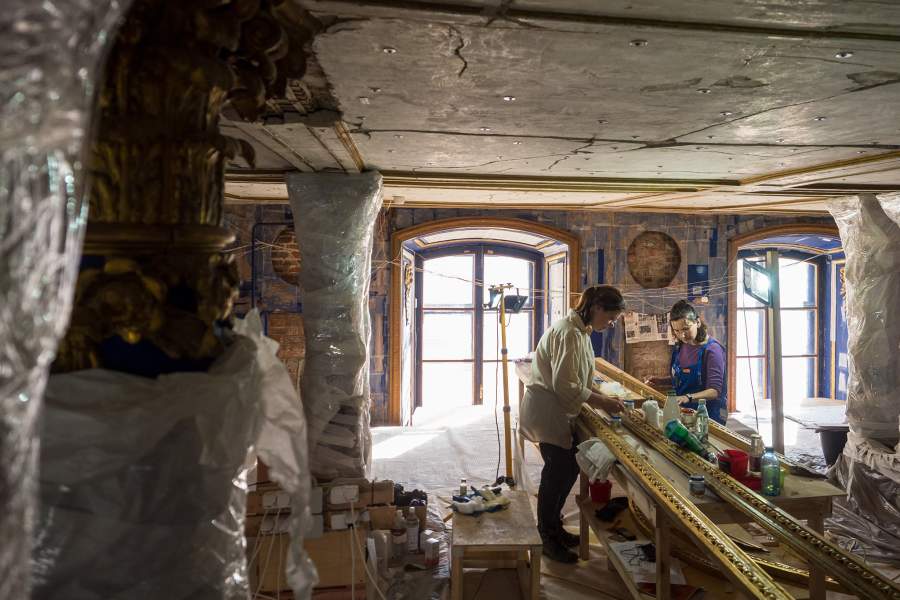 Работы продолжались на протяжении четырех лет, в них принимали участие 350 специалистов — позолотчики, лепщики, краснодеревщики, живописцы, альфрейщики (мастера по росписи потолков и стен)