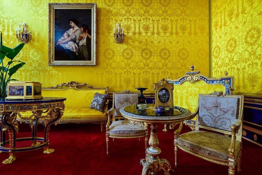 Уникальные интерьеры Лионского зала с отделкой из лазурита, паркетом из амаранта, палисандра, пальмы, черного и розового деревьев и перламутра, с шелковыми обоями были также практически полностью утрачены во время войны