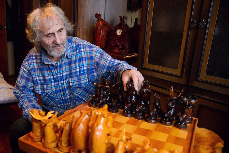 Валентин Андреевич расставляет собственноручно вырезанные им шахматы