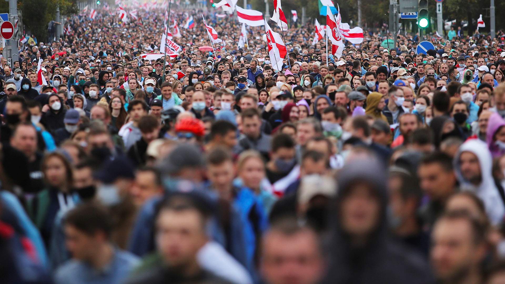Пик протестного шествия пришелся на пять часов вечера — когда демонстранты убедились, что марш проходит без массовых задержаний. По данным собкорра «Известий» в Минске, у стелы, несмотря на проливной дождь, собралось порядка 70–100 тыс. человек, толпа растянулась на три километра.