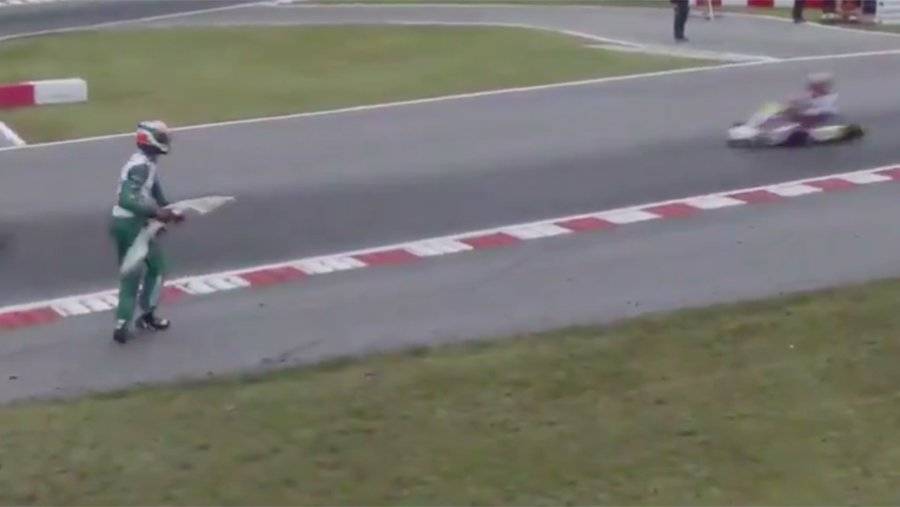Гонщик Лука Корбери во время финала чемпионата мира по картингу бросил в своего соперника кусок бампера.