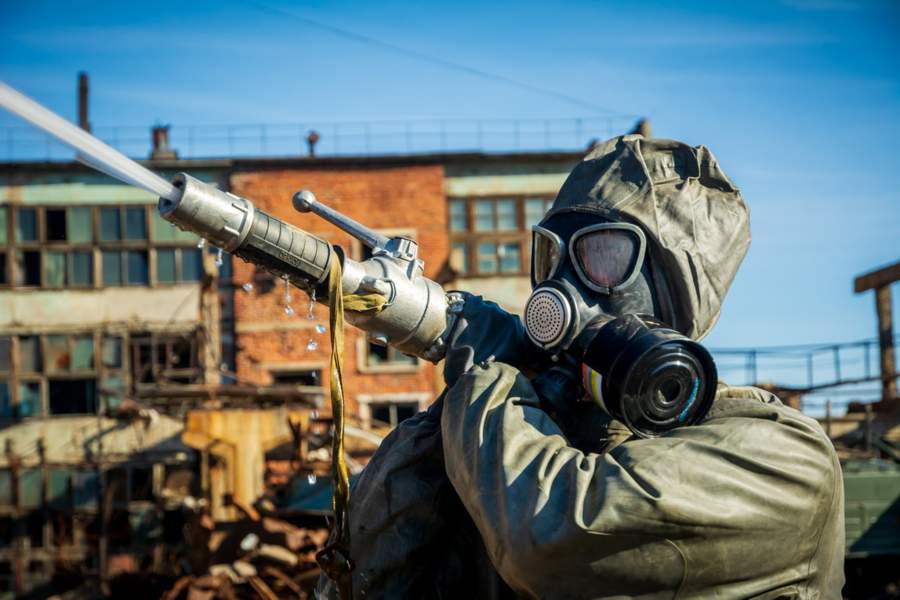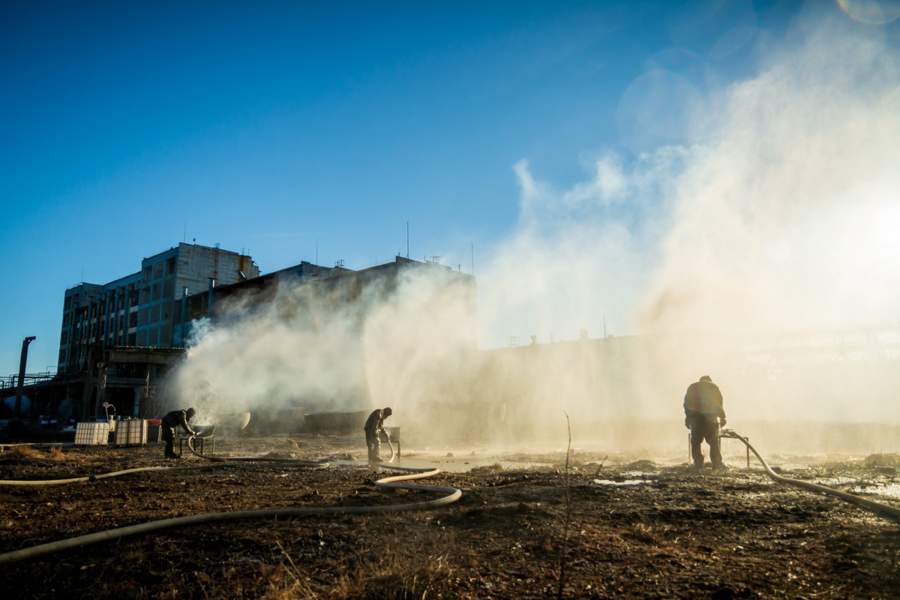 Военным пришлось ставить водяные завесы при перемещении химических веществ из аварийных емкостей. А также проливать водой железобетонные конструкции и предотвращать распространение пыли при демонтаже цеха ртутного электролиза