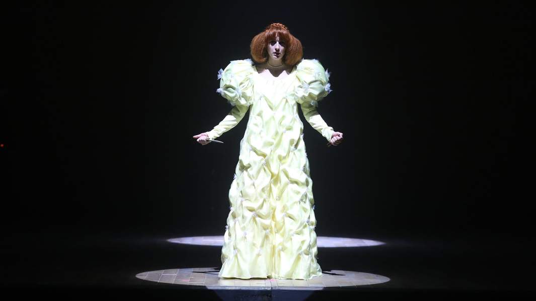 На малой сцене театра антураж рок-концерта: ударная установка с инструментами, микрофоны. В самом конце драматическое действие вдруг переключается в концерт, актрисы поют, причем то, что по стилю идет вразрез с «магическим театром» одиноких голосов, на который нас настроили; например, песни Юрия Шевчука и группы «Тату». Но таким образом режиссер достигает удивительного ощущения свободы и преодоления границ, что как раз важно для этого текста.