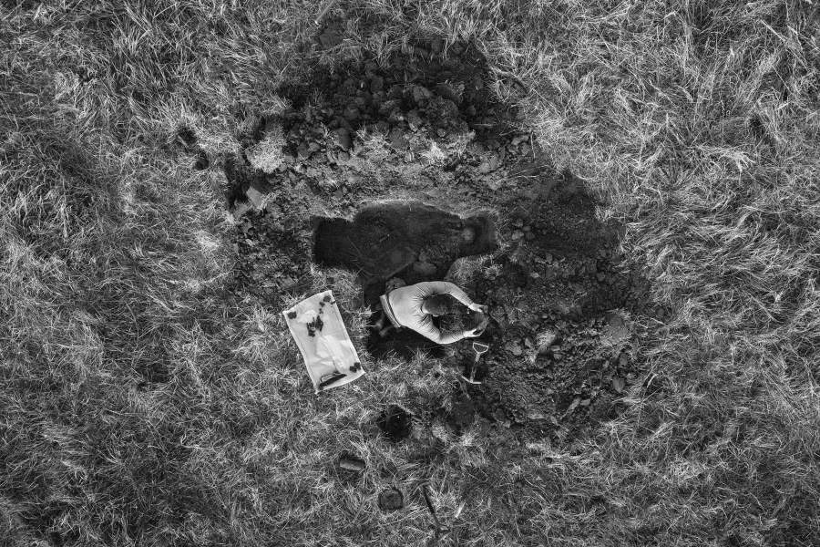 В поле часто работают парами. Сначала идет человек с металлоискателем. Поймав сигнал, он ставит метку, второй — с лопатой и щупом — ведет раскопки