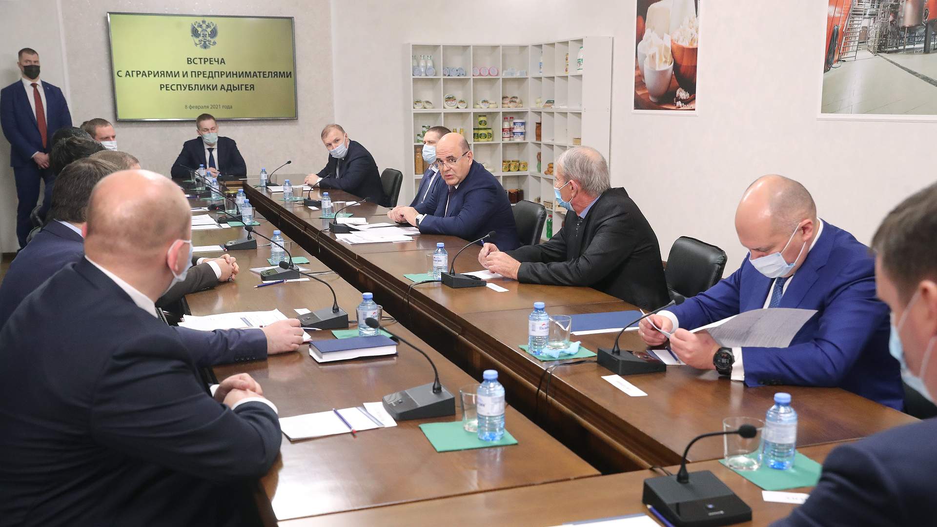 Адыгея славится своим сыром, поэтому Михаил Мишустин решил прежде всего посетить фабрику по его производству. Осматривая предприятие, премьер увидел весь цикл приготовления и упаковки. Процесс частично автоматизирован, впрочем, работы для сотрудников хватает — например, они помогают пропускать сыр, а также заплетают его в косичку.