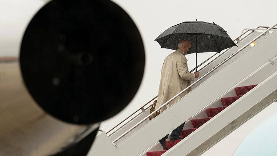На кадрах запечатлено, как Байден поднимается по трапу в дождливую погоду. В руках он держит дорожную сумку и зонт. На одной из ступенек американский лидер спотыкается, но удерживается на ногах, дойдя до верхней площадки трапа.