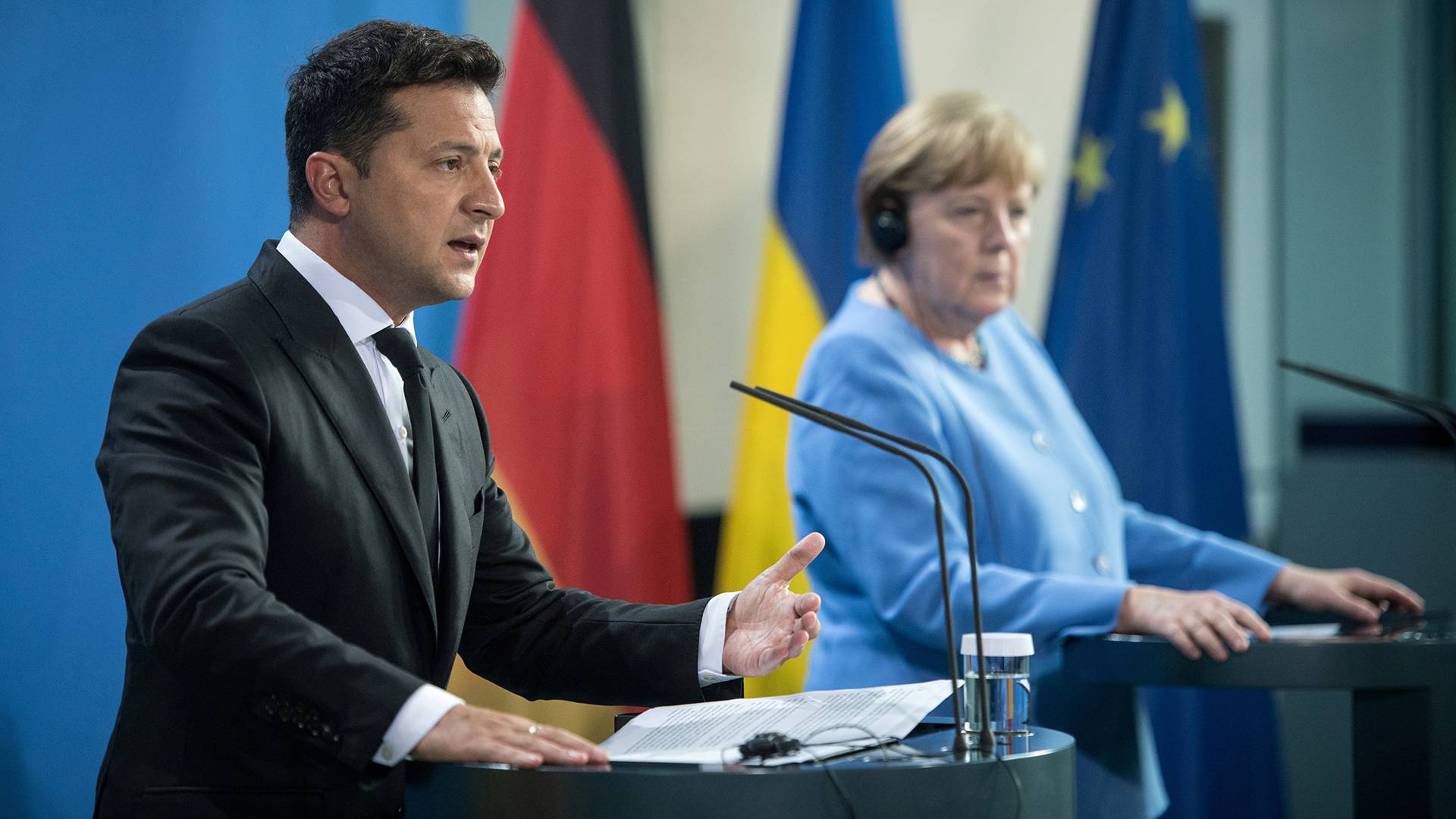 12 июля Зеленский и президент ФРГ Франк-Вальтер Штайнмайер провели переговоры в Берлине, на которых обсудили проводимые киевскими властями реформы. В Германию украинской лидер прибыл накануне по приглашению Меркель.