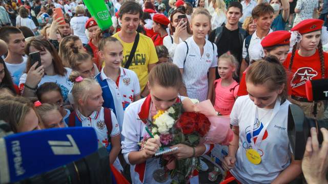 — Непередаваемые эмоции! Большое спасибо болельщикам и руководителям, что так нас встретили! — сказала «Известиям» семикратная олимпийская чемпионка по синхронному плаванию Светлана Ромашина. — Мы ради наших поклонников и ради нашей страны ехали в Токио и боролись там за победы. Благодарны за то, что люди так нас приветствуют.