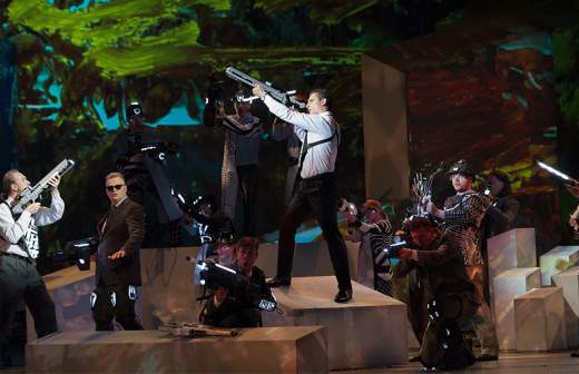 «Электротеатр» — одна из редких столичных трупп, с успехом работающая в жанре комедии дель-арте. Достаточно вспомнить впечатляющий спектакль Бориса Юхананова «Пиноккио», отмеченный в нынешнем году двумя «Золотыми масками». Один из соавторов этого шедевра — итальянец Алессио Нардин, режиссер-педагог по работе с масками, ставивший шоу на Венецианском карнавале, теперь выступил в качестве постановщика, хореографа и художника шекспировского «Сна в летнюю ночь». Понятно, что решена постановка в жанре комедии масок.