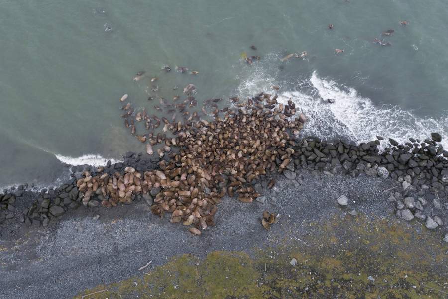 Порой количество моржей на лежбище достигает нескольких тысяч. Обычно они выходят на берег в конце августа – начале сентября, но в этом году задержались. Они собирались в большие группы на воде, окружая мыс с разных сторон, но сильные шторма и присутствие десятка белых медведей не позволяли ластоногим надолго задержаться на берегу