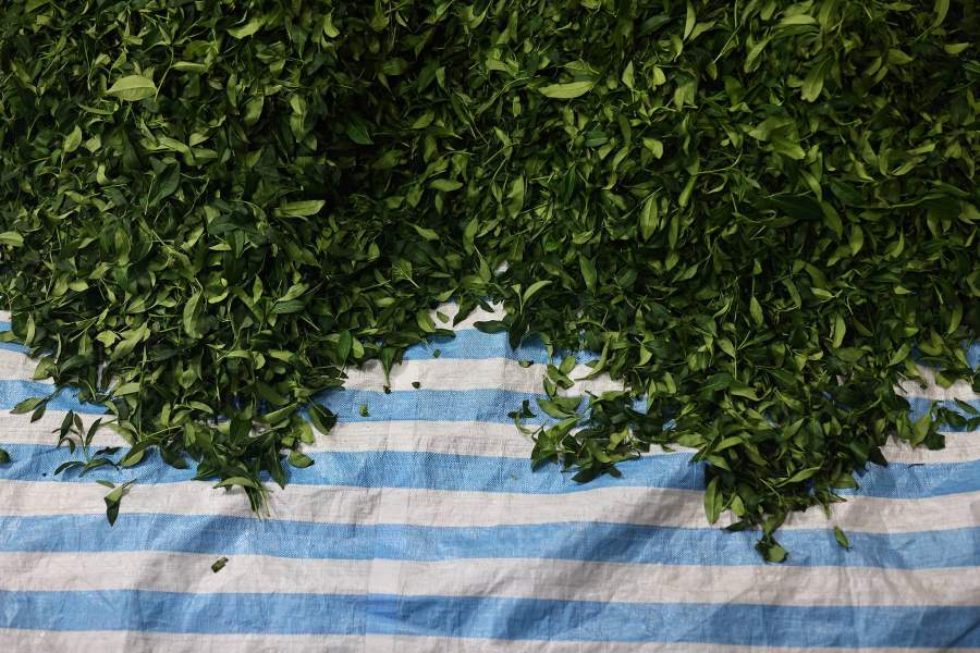 Собранные листья ссыпают на расстеленную под открытым небом ткань