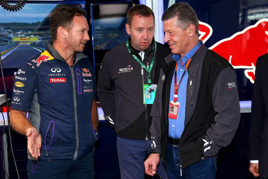 Руководитель команды Infiniti Red Bull Racing Кристиан Хорнер и заместитель премьер-министра России Дмитрий Козак в гараже перед квалификацией на Гран-при России