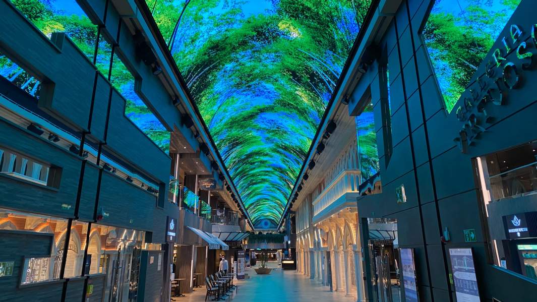 Длина променада — 111 м, а его главная фишка — «цифровое небо». Крыша галереи — это огромный светодиодный экран от компании Samsung длиной почти 100 м. В разное время суток он меняется, и создается впечатление, что ты каждый раз идешь по новой улице.