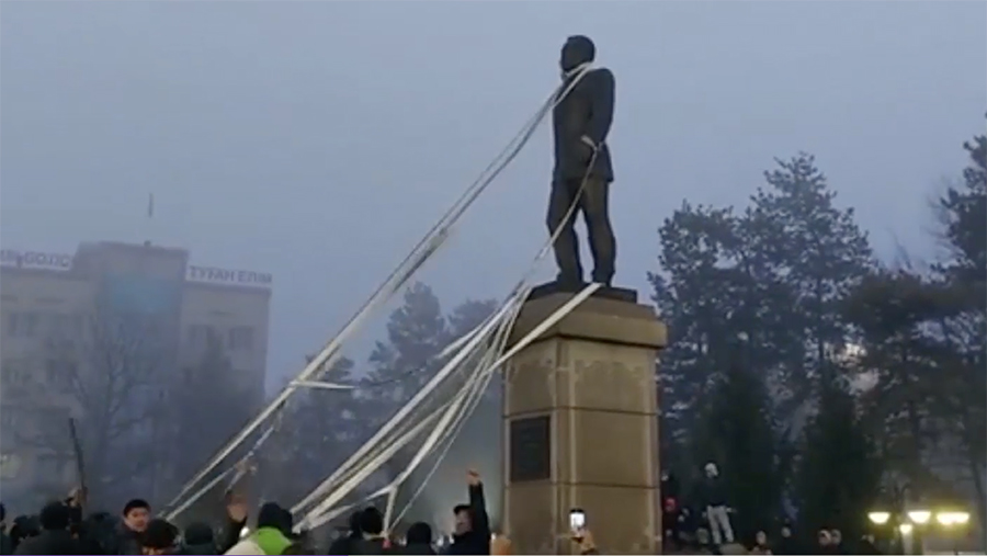 В городе Талдыкорган на востоке Казахстана группа протестующих пыталась свалить с постамента памятник бывшему главе государства Нурсултану Назарбаеву. На кадрах, которые появились в Сети, видно, как несколько десятков человек пытаются снести монумент, набросив на него веревки.