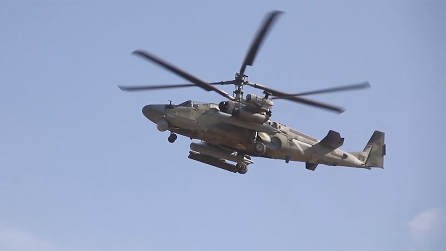 «Звено вертолетов Ка-52, в ходе огневой поддержки наступающих войск, с режима висения, противотанковым ракетным комплексом «Вихрь» уничтожили назначенные цели без входа в зону поражения ПВО противника с расстояния свыше 7 тыс. м», — говорится в описании к ролику.