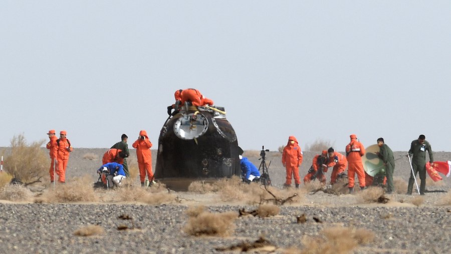 Спускаемая капсула китайского космического корабля «Шэньчжоу-13» с тремя тайконавтами приземлилась на посадочной площадке Дунфэн в автономном районе Внутренняя Монголия на севере КНР. Об этом в субботу, 16 апреля, сообщает Центральное телевидение Китая.