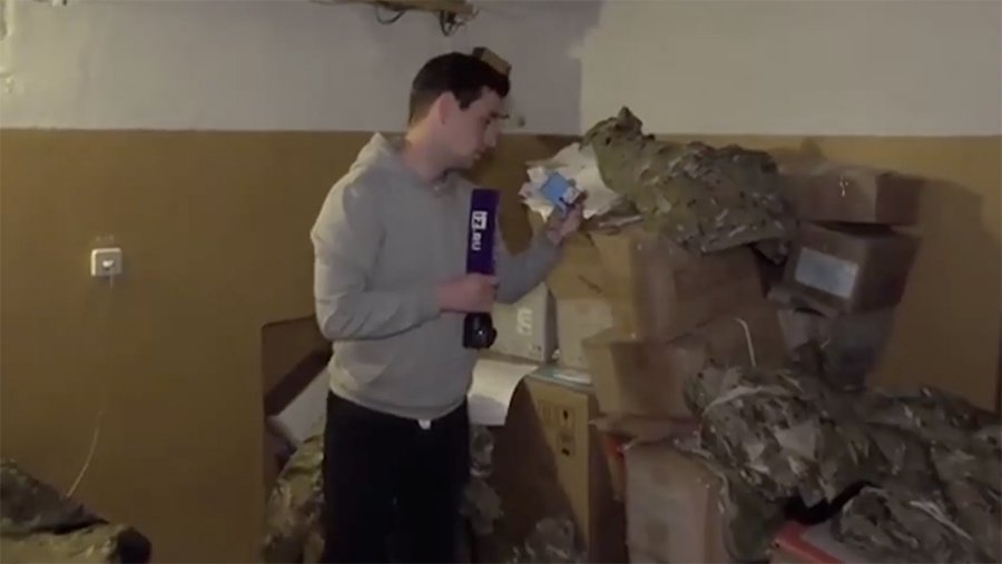 Склад был оборудован в помещениях подвала. В комнатах хранятся коробки с новой, еще не распечатанной военной формой и берцами. Также были обнаружены удостоверения и шевроны.