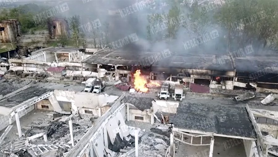 На кадрах можно оценить масштабы разрушений. На территории предприятия всё еще горят строения и оборудование. Разбитыми оказались огромные емкости для зерна, а также грузовые автомобили.