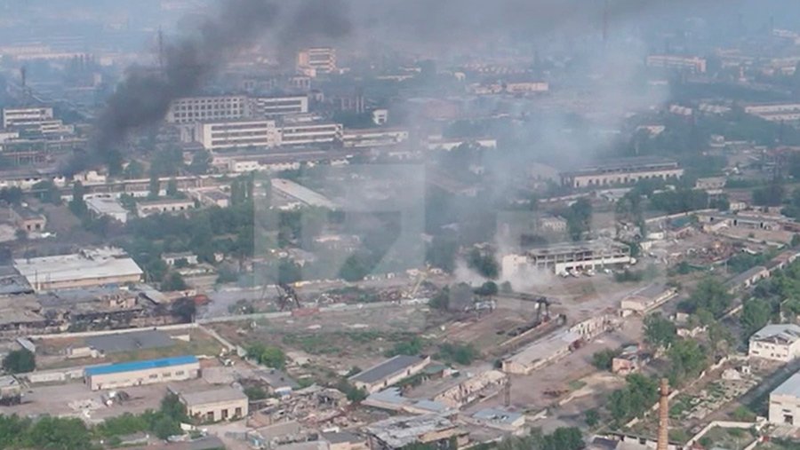 На представленных записях видны разрушения, которым подверглась территория завода. Кроме того, можно заметить многочисленные источники дыма, идущего из зданий промзоны.