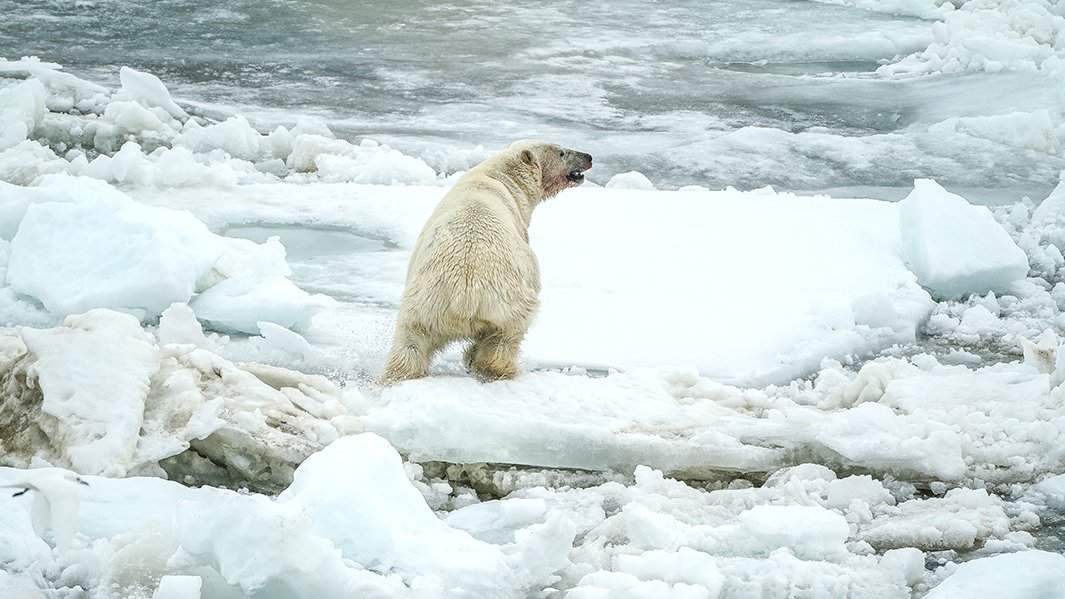 По пути на юг встречаем на удивление много животных — и моржей, и лежбище кольчатых нерп, и белых медведей. Один из них на наших глазах ловит нерпу. Кстати, одинокие белые медведи в Арктике — в основном самцы. Самки почти всегда с одним-двумя медвежатами, рассказывает Виктор Ильич. Если медвежонка три, то один — усыновленный.