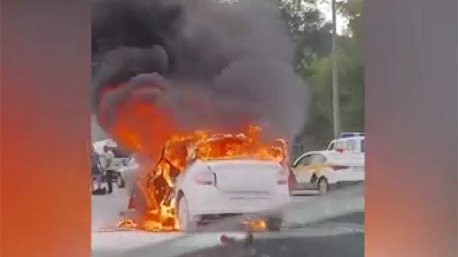 На ролике видно, что белый автомобиль полностью объят пламенем, от которого исходят клубы дыма. Рядом на асфальте лежат огнетушители. Другие машины проезжают мимо него по проезжей части.