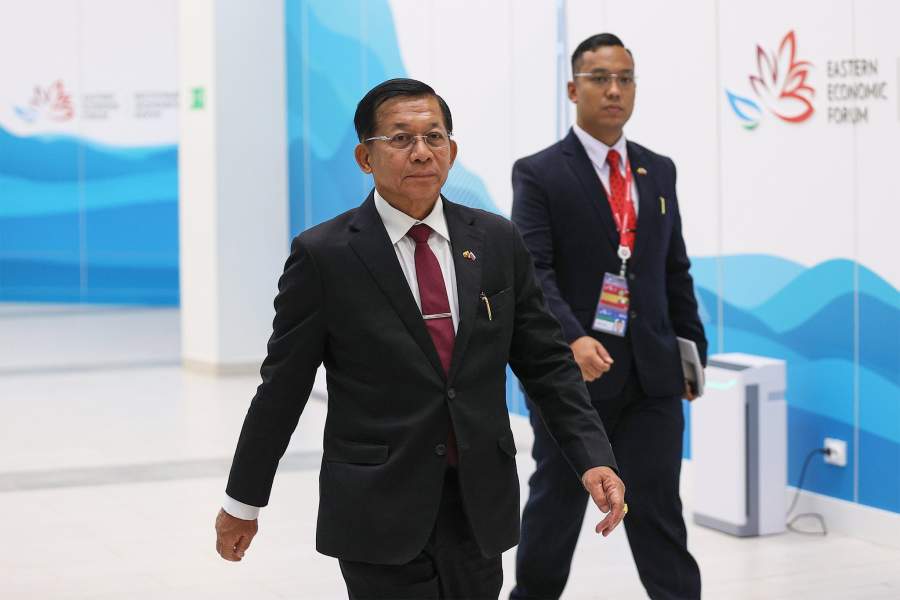 Председатель Государственного административного совета, премьер-министр Временного правительства, главнокомандующий вооруженными силами Республики Союз Мьянма Мин Аун Хлайн перед началом встречи с президентом РФ Владимиром Путиным на полях VII Восточного экономического форума во Владивостоке