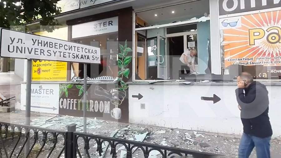 Военкор показал улицы города, где из-за атаки в зданиях были разбиты стекла, разрушено дорожное покрытие, а также повреждена машина. Кроме того, на кадрах видно, что в результате обстрела есть погибшие.