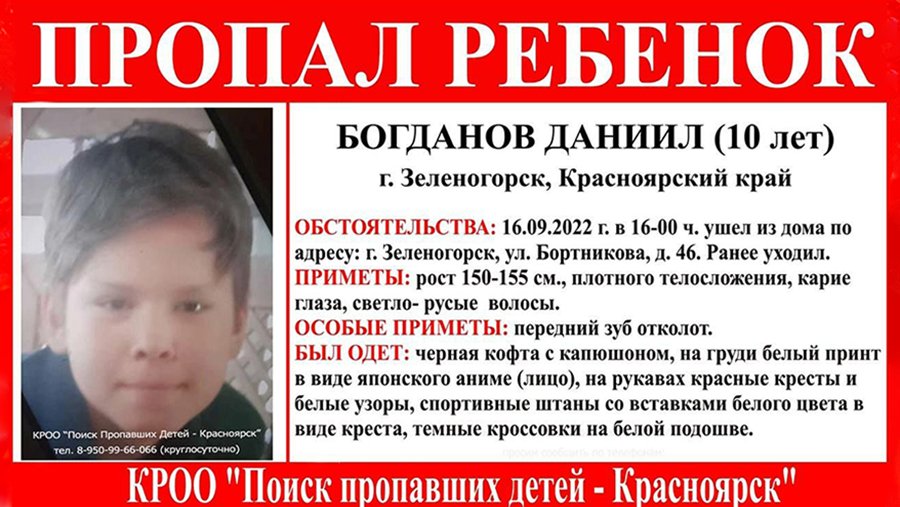 В Зеленогорске Красноярского края пропал 10-летний мальчик. Об этом в субботу, 17 сентября, сообщает Telegram-канал ЧП 124.
