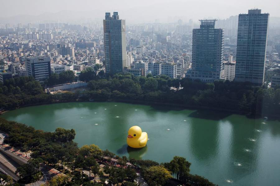 Гигантская резиновая утка авторства голландского художника Флорентина Хофмана появилась теперь и на озере Сокчон в Сеуле