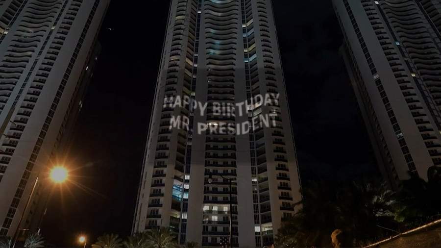 В США поздравили президента России Владимира Путина с 70-летием, спроецировав надпись на высотке Trump Tower в Майами. Видеозапись проекции появилась в социальных сетях.