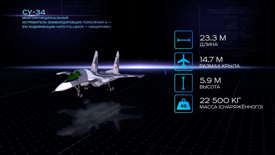 Истребитель-бомбардировщик Су-34 производится с 2008 года. Предназначен для нанесения ударов авиационными средствами поражения по целям противника в оперативной и тактической глубине.