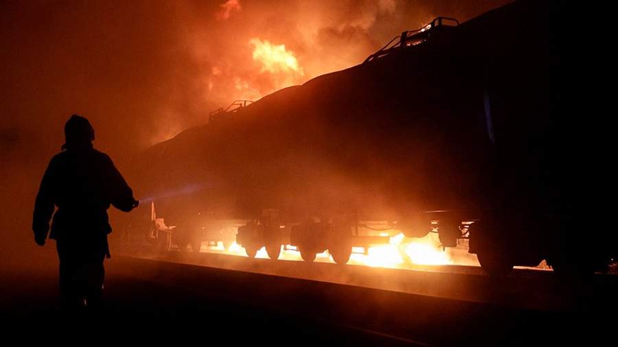 «По прибытии было установлено, что в результате попадания ВОП (взрывоопасного предмета. — Ред.) происходит горение 12 цистерн с топливом на ж/д полотне, а также кровли железнодорожной станции», ― говорится в сообщении.