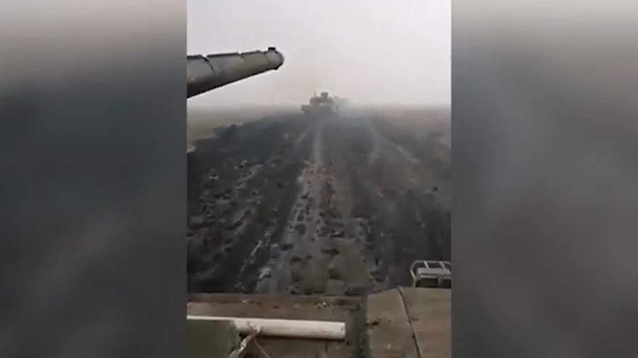 Как следует из кадров, минимум два танка двигаются на высокой скорости по грунтовой дороге. При этом на местности наблюдается густой туман.