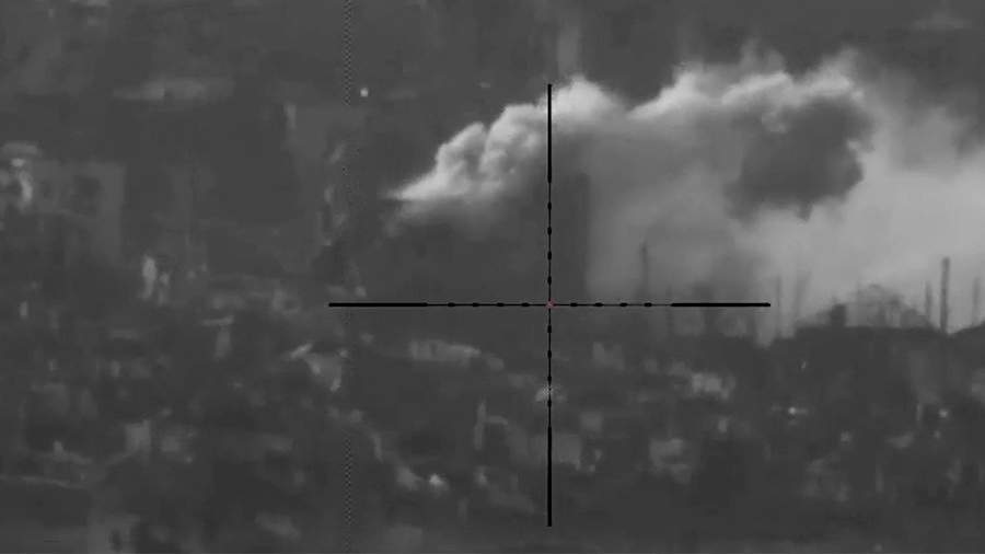 «Артиллерия уничтожает выявленные опорные пункты противника в городской застройке Марьинки», — говорится в описании к видео.