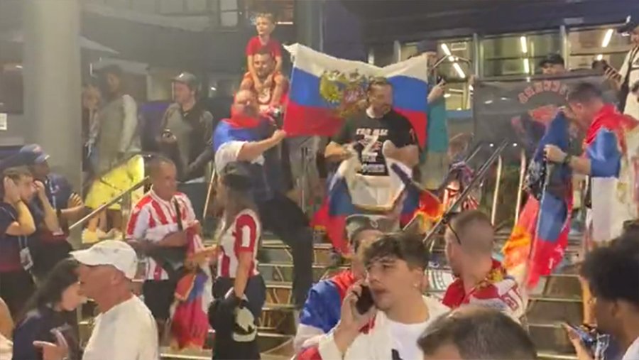 Так, несмотря на введенный запрет, болельщики, среди которых были и сербы, всё равно держали флаги РФ, а некоторые из них были в майках с буквой Z.