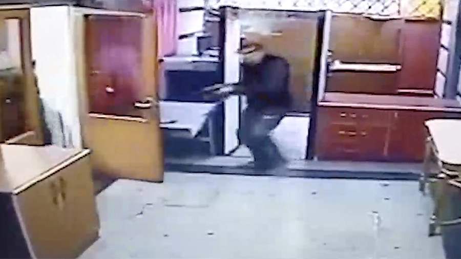 На них видно, как мужчина с оружием в руках врывается в здание и начинает стрелять. Затем один из сотрудников посольства начинает с ним бороться, пытаясь остановить.