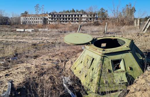 — Натовские плиты, но они им не помогают, — сотрудник «Вагнера» показывает пробитую керамическую бронепластину из бронежилета, найденную среди остатков украинского снаряжения у входа в подъезд многоэтажного дома. В здании хорошо видны места украинских огневых точек, а рядом стоят разбитые машины: армейский грузовик, микроавтобус, использованный для эвакуации, и пикап с турелью для противотанковых комплексов. Одну из огневых точек уничтожил танк, на бетонной стене хорошо видно попадание снаряда. У входа и внутри подъезда — следы пуль и разрывов гранат, здесь штурмовики «Оркестра» врывались внутрь, порвав дистанцию и перейдя в ближний бой.