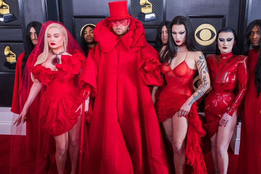 Певец Сэм Смит сделал ставку на пышную алую накидку Valentino, и это было не лучшим решением. Объемный воротник в сочетании с тростью и цилиндром смотрится крайне нелепо, а вуаль на лице лишь добавляет образу несуразности. В защиту Сэма скажем, что его выход на дорожку был задуман как перформанс, а костюм оказался лишь частью сценического облика. Вместе с Ким Петрас певец исполнил песню под названием Unholy, представ в образе дьявола и тем самым обосновав цветовую гамму своего образа. Артисты получили статуэтку в номинации «Лучшее поп-исполнение дуэтом или группой»