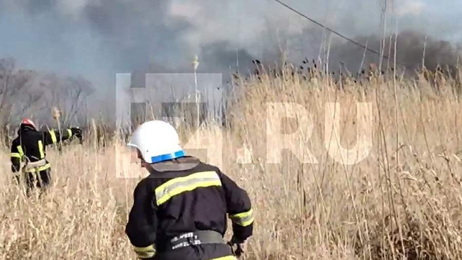 В результате загорелась сухая трава. На месте работают пожарные.