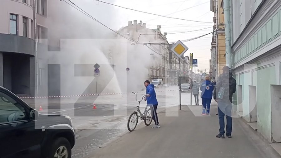 На записи видно, как улицу заливает кипятком и затягивает паром. Струя горячей воды между тем поднимается и бьет в окна одного из зданий.