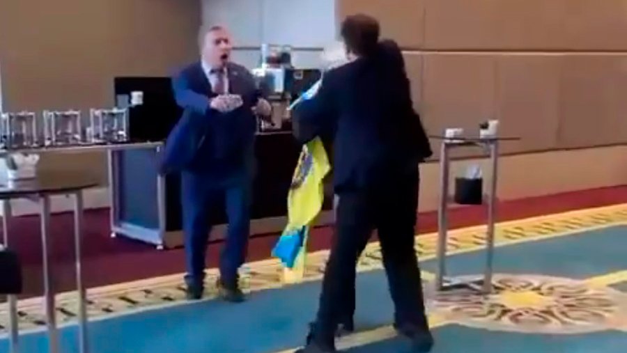 Затем член делегации Украины Александр Мариковский напал на секретаря российской делегации Валерия Ставицкого, когда тот забрал у него украинский флаг, которым украинский дипломат размахивал за спиной у Тимофеевой.