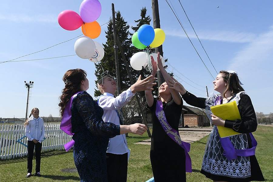 Единственные выпускники Грузенской средней общеобразовательной школы Александра Дукачёва и Денис Ковалёв со своими классными руководителями выпустили в небо воздушные шарики у сельского клуба. Школа в селе Грузенка — одна из малокомплектных школ Красноярского края, в которой в 2023 году учатся 49 детей с 1-го по 11-й классы