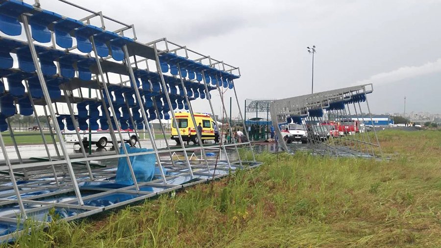 Сообщение об обрушении трибуны на улице Пойменной поступило в ведомство в 16:25. Группа с детьми пряталась от дождя под навесом, где у них проходили соревнования. Трибуны не выдержали сильного ветра и перевернулись.