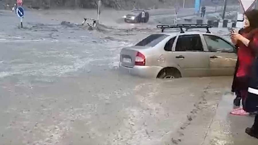 В результате непрекращающихся дождей все дороги оказались затоплены — уровень воды почти полностью перекрывает колеса легковушки на видео.